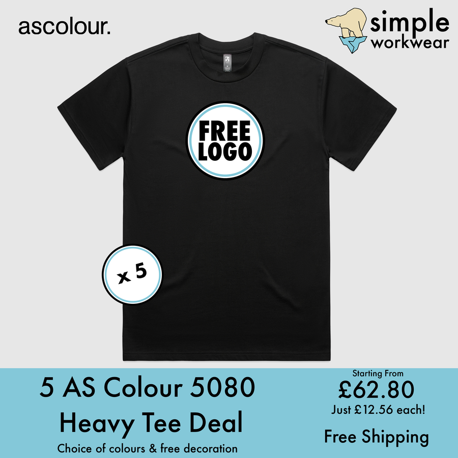 BUNDLE X 5 AS Colour 5080 Heavy Tee T-Shirts With Free DTG Print